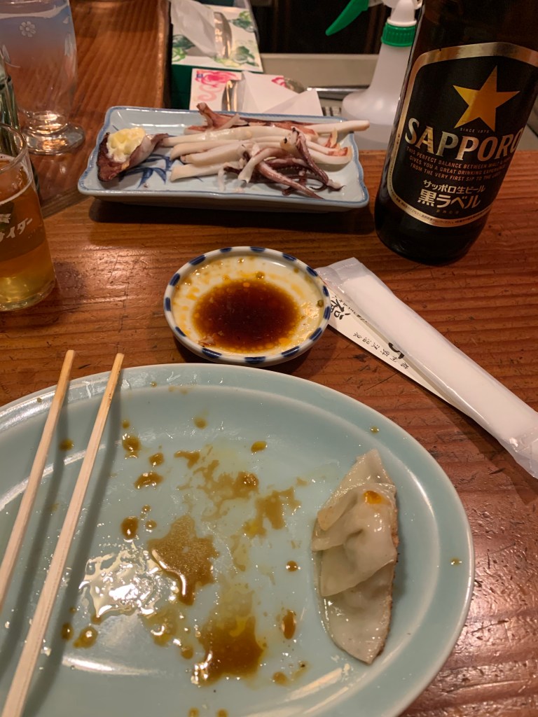 Dinner: Gyoza and grilled octopus + worlds largest “1 beeru” 1900yen $21.45