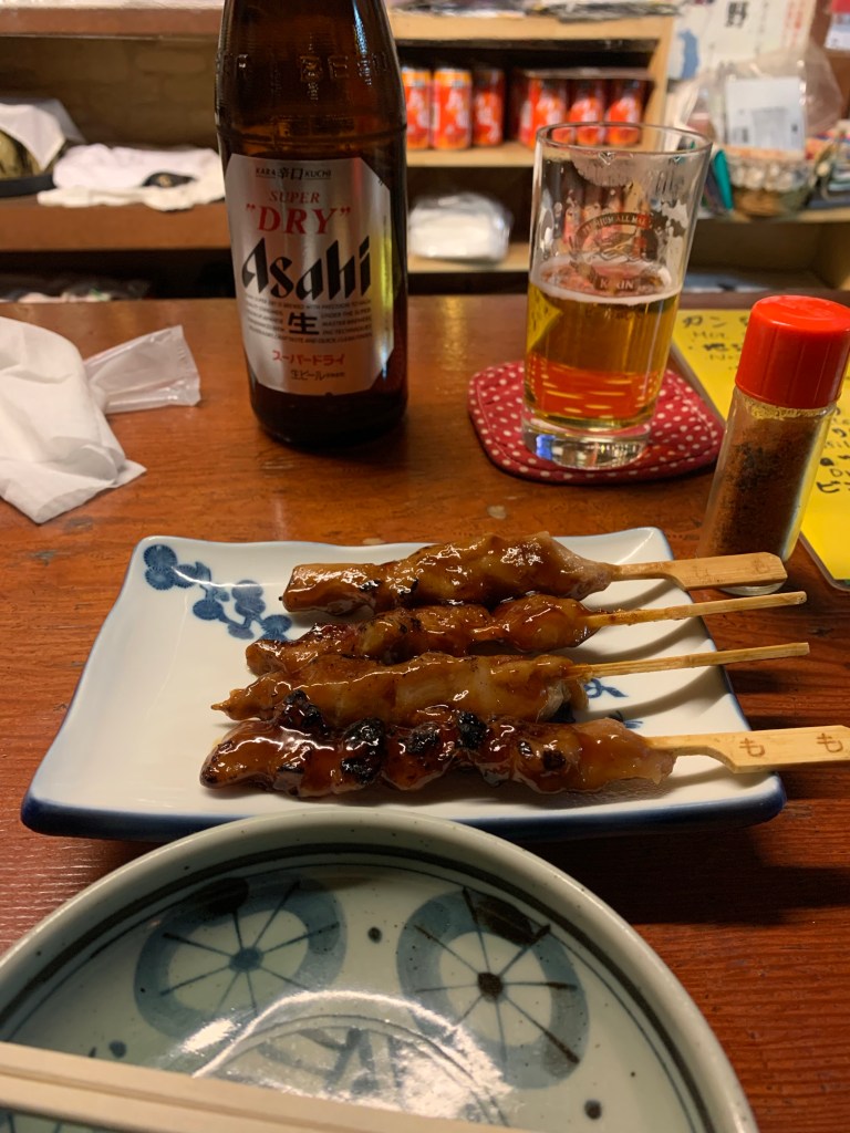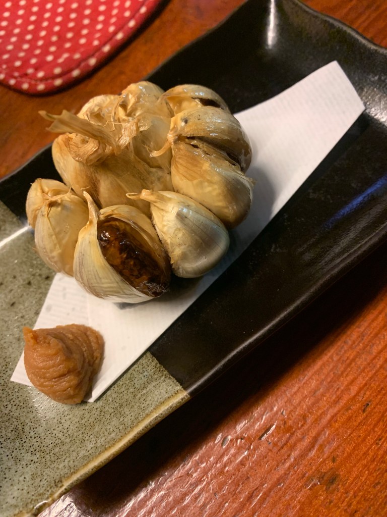 Dinner: chicken kebab, Nozawa Pickles Shumai Steamed Dumpling, Blooming Garlic with miso dip + 1 small(er) beeru 2,000 yen $22