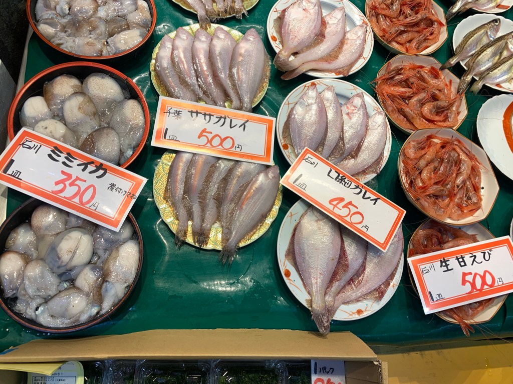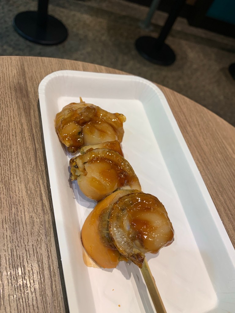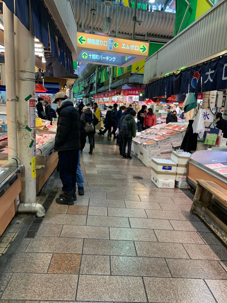 It was nearly lunchtime, so I headed through to the Omi-cho fish markets. It’s already so cold in this market, that the fish mongers just leave their ice out overnight for the market the next day. So to see sea urchins, giant snow crabs, various cockles and molluscs and fish out in the open didn’t conjure up the sights and smells you might get anywhere else in the world. Firstly there was no smell, just loads of lovely fresh looking fish. Many mongers sold sashimi cuts of just about every fish they had, for passers by. By this stage I had been out walking in snow drifts for 3 or so hours, so I opted for grilled scallops, as I needed something slightly warming!
