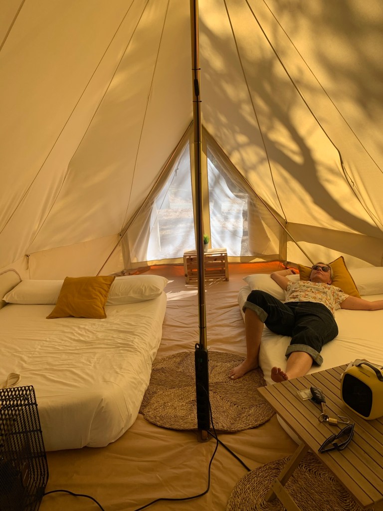 When researching campsites “near” Lisbon, we noted that for €4 more than a camp site, we could get a glamming site! So what would you chose… your own wet messy tent, tiny inflatable mattress etc, or a safari style clapping tent with 2 queen beds, fridge, fan etc? I can tell you what we chose!
